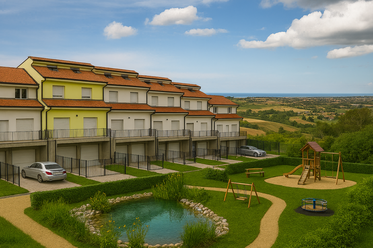 12 villette a schiera dal design contemporaneo, immerse nel verde, con vista mare panoramica aperta sul paesaggio collinare.